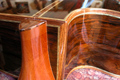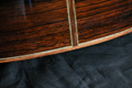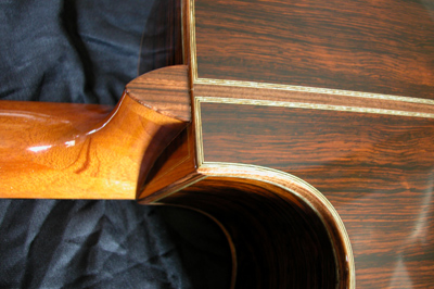 Detail of where the neck joins the body. Maple binding on the fingerboard. 1990 M model in maple with bear claws, Brazilian rosewood