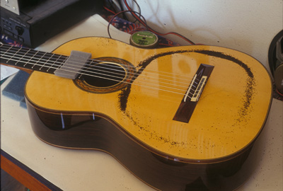 I test the vibrations in the soundboard to assess their mechanical behaviour and sound production three times during construction.